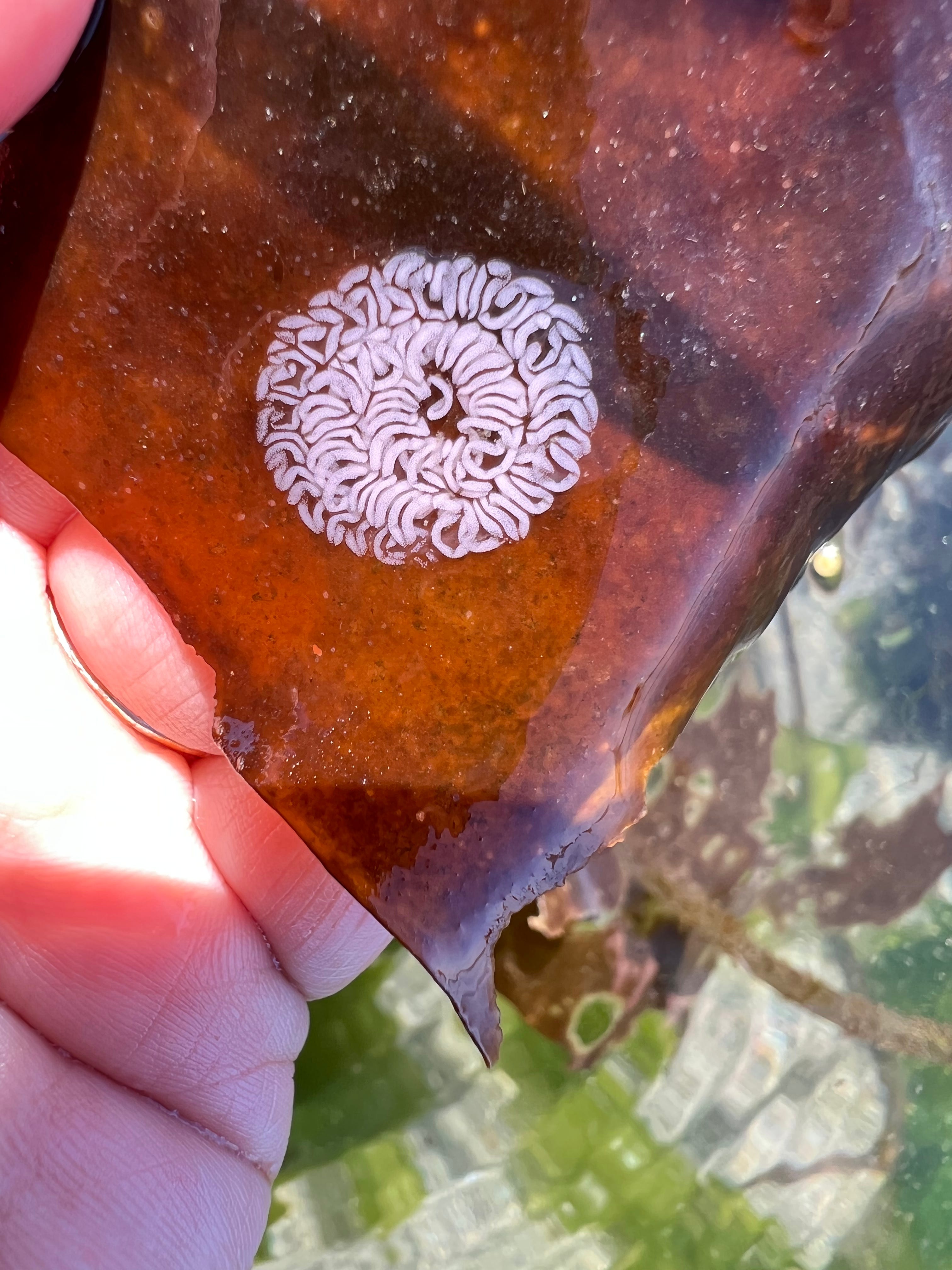 Regular, almost daily, nature walking and keeping a nature journal brings me in contact with beauty, mystery, awe, curiosity, and delight - all of these emotions nurture my spirit. Walking slowly along the beach at low tide one day, I spotted what looked like mucus2 on a blade of kelp. Using the zoom on my phone camera, I discovered that what looked amorphous at a distance was, close up, actually a lovely regular swirl and within that swirl were an even finer texture made of dots. Later I learned that this was an egg mass of a marine animal - most likely a nudibranch or marine slug3. Finds like the egg mass (in the photo below) spark a visceral and emodied sense of connection to my more-than-human relatives.