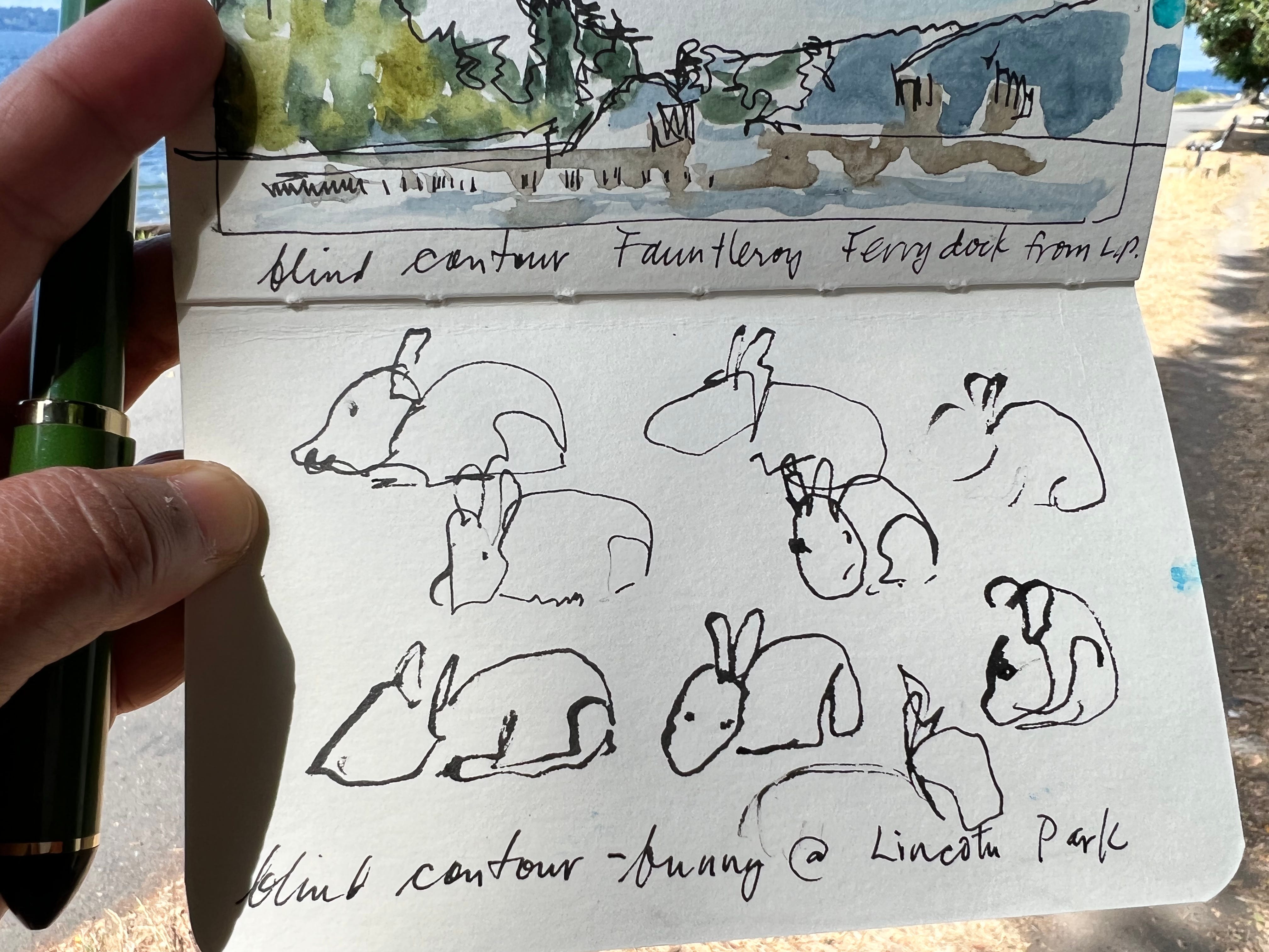 My favorite nature drawing activities that help me practice attention are blind contour and gesture drawing. For those who are coming across blind contour technique for the first time, a blind contour is a drawing done without ever looking down at your paper! What? How does one draw without looking? I do this by imagining that my eyes and hand are linked like a pantograph drawing tool. I move my eyes along the edges of my subject and my hand tries it’s best to move exactly as my eyes move - as if they are physically connected.