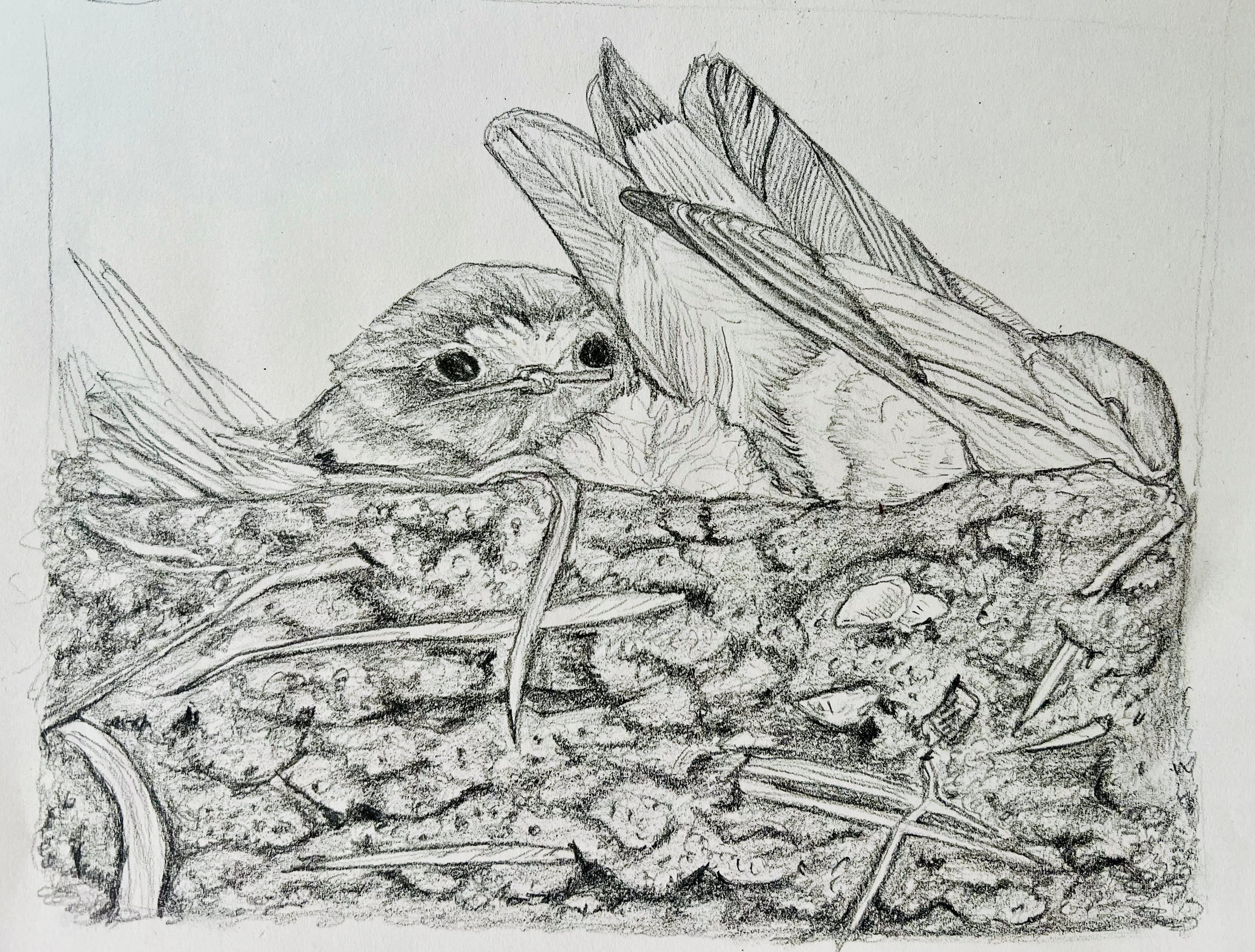 In 2008 I drew a sketch of a nest of barn swallows (shown above). At the time, I was going through another wave of trying to establish a nature journaling practice and spent many days working on this one piece. I love this sketch. I remember well my joy and excitement upon discovering the nest, climbing on a ladder, holding the camera in my outstretched arms to get the photo. I’m almost certain I traced the general outlines then enjoyed the process of building up the values slowly. But I haven’t reproduced this type of work (much) since. Obviously, this level of detail requires a longer investment in time and I have gravitated away from it, life being already full of time-consuming and necessary tasks.
